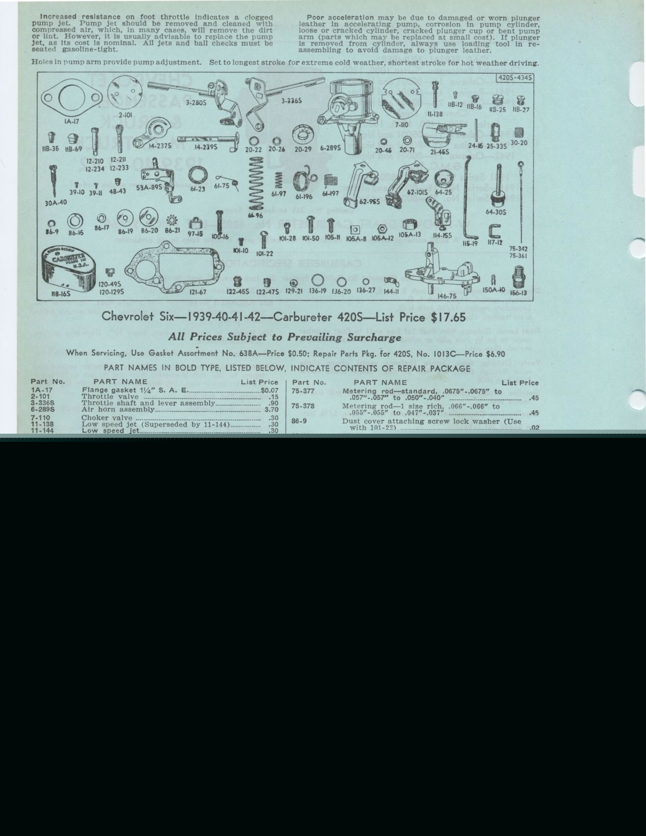 Chevrolet Six— 1939-40-41-42—Carbureter 420S—List Price $